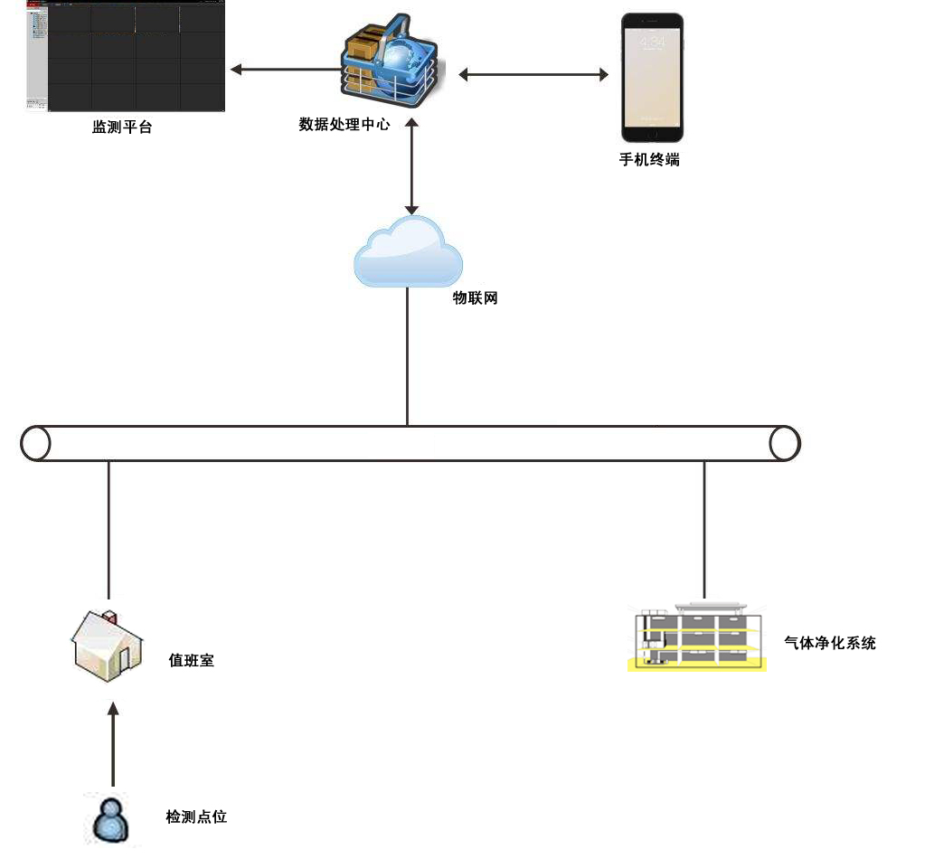 本系統(tǒng)主要由手套箱點(diǎn)位檢測、廠房集中監(jiān)測,中心控制室集中監(jiān)測三部分組成(如圖所示)